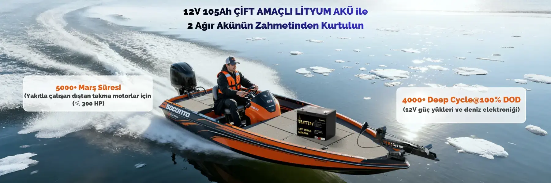 IBATTERY 12V 105 Ah Çift Amaçlı Akü, dıştan takma motorunuzu güvenle çalıtırmanızı ve gün boyu teknedeki elektronik cihazlarınızı (ışıklar, radar, balık bulucu ve daha fazlası ) çalıştırmanızı sağlar.