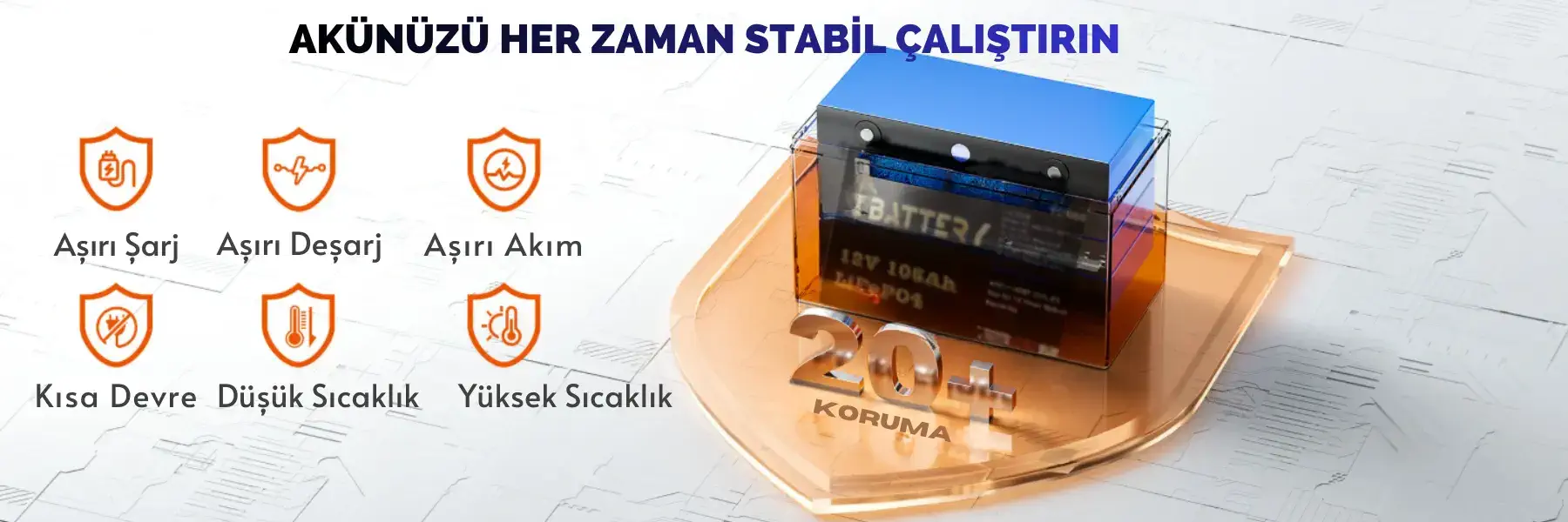 IBATTERY 12V 105 Ah Çift Amaçlı Akü, aşırı şarj, aşırı desarj, aşırı akım ,aşırı ısınma ve kısa devrelere karşı koruma sağlayan 20'den fazla akıllı koruma özelliğine sahip Daly Bms ile donatılmıştır. Düşük sıcaklıkta kesme, nem ve tuz püskürtme direnci ve aşırı yükten 30 saniye içinde otomatik kurtulma özelliğiyle geliştirilmiş bu akü, zorlu ortamlarda bile güvenilir performans sağlar.