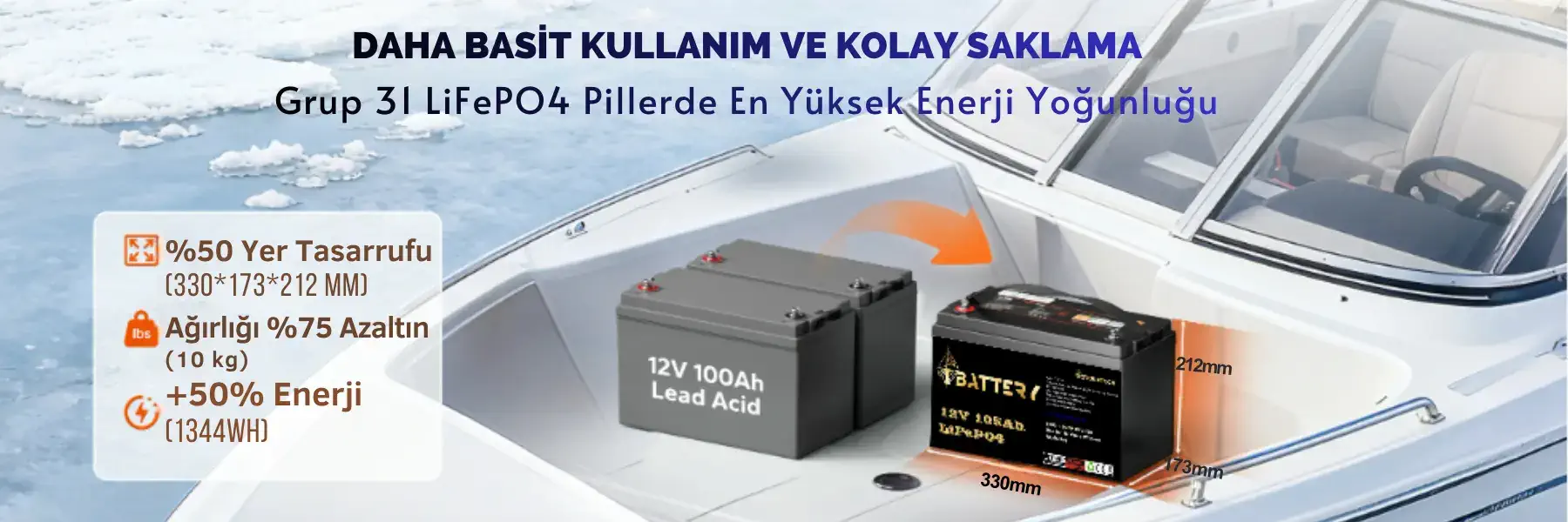 IBATTERY 12V 105 Ah Çift Amaçlı Akü, iki adet 12V 100Ah kurşun asit aküye kıyasla %76 daha fazla enerji (2112 Wh) sağlarken %50 yer tasarrufu ve %75 ağırlık tasarrufu sağlar.Kompakt Grup 31 boyutunda, daha kolay kurulum, ekstra depo alanı ve daha uzun çalışma süresinin keyfini çıkarın.