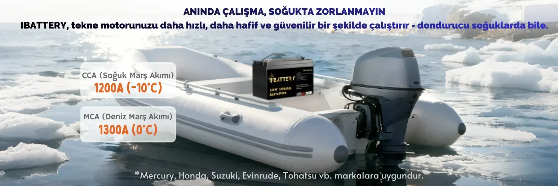 IBATTERY 12V 105Ah Çift Amaçlı Akü, Mercury, Honda, Suzuki, Evinrude, Tohatsu ve daha fazlası dahil olmak üzere en popüler dıştan takma motor markalarına güç sağlamak için tasarlanmıştır.